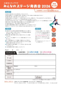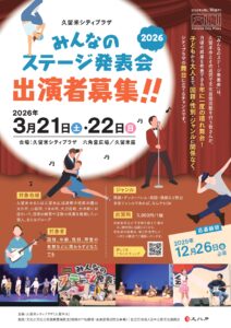 《出演者募集/福岡》 みんなのステージ発表会 2026 【日 時】2026年3月21日(土)・22日(日) 【対象地域】久留米市または久留米広域連携中枢都市圏の大川市、小郡市、うきは市、大刀洗町、大木町にお住まいで、日頃の練習や活動の成果を発表したい個人、またはグループ 【対象者】国籍、年齢、性別、障害の有無などに関わらずどなたでも 【ジャンル】舞踊・ダンス・バレエ・民謡・演劇など舞台芸術ジャンルであれば、なんでもOK 【出演料】5000円/1組 【申込締め切り】2025年12月26日(金)必着 【会 場】久留米シティプラザ 六角堂広場/久留米座 詳細はコチラ