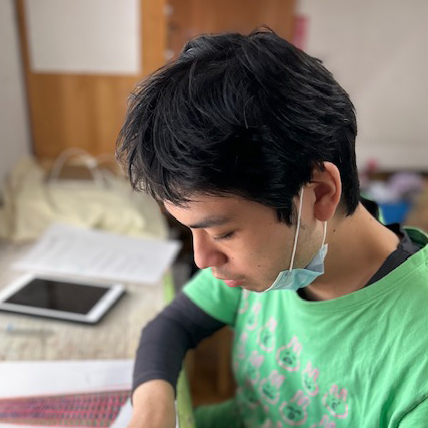 1996年生まれ。福岡市在住。2015年より工房まるに所属。小さい頃から自分の中に描いてきた壮大な(?)物語を、イラストやマンガ制作、立体建築模型づくり、オリジナルの創作文字などで表現している。絵の具やパステル、クレヨンなど多種の画材を使い分けて描かれる作品は、繊細さを感じさせる一方、ユーモアもふんだんに盛り込まれており、彼のキャラクターと等しく映るが、まだ未開な部分も感じられ、今後新たな一面が表に出てくる可能性も大。