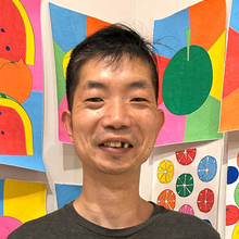 1989年生まれ。2008年より工房まるに所属。カラフルな色づかいに、ゆる〜い線。制作中の絵を「ほら、見て見て〜!」と周囲に呼びかけるのが口グセ。みんなに褒めてもらって、モチベーションを上げて、日々ポジティブに創作している。観た人がパッと明るい気持ちになるようなタッチで、動物や人物、植物、さらには建物や乗り物なども、彼の描くものは、どれも楽しそうに映る。